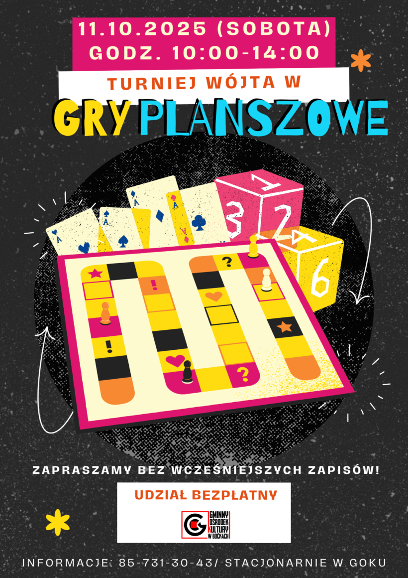 Gminny Ośrodek Kultury w Boćkach zaprasza na wyjątkowe wydarzenie – Turniej Wójta w Gry Planszowe! To doskonała okazja, aby spędzić czas w miłej atmosferze, spotkać się ze znajomymi i poznać nowe gry. 📅 Data: 11 października 2025 (sobota)🕙 Godzina: 10:00 – 14:00📍 Miejsce: Gminny Ośrodek Kultury w Boćkach Ważne informacje: Serdecznie zapraszamy wszystkich miłośników planszówek […]