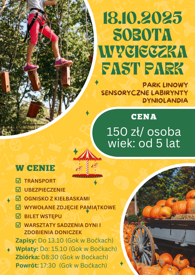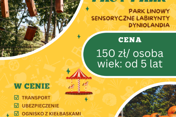 18 października 2025 – wycieczka, której nie można przegapić! Zapraszamy na niezapomnianą sobotę pełną emocji, zabawy i jesiennych klimatów! Fast Park czeka z mnóstwem atrakcji dla całej rodziny. 🎯 Co Was czeka? 🌲 Park Linowy – pokonaj trasy na wysokości i poczuj dreszczyk emocji! 🧩 Sensoryczne Labirynty – rozwijające zmysły przygody 🎃 Dyniolandia – magiczne […]