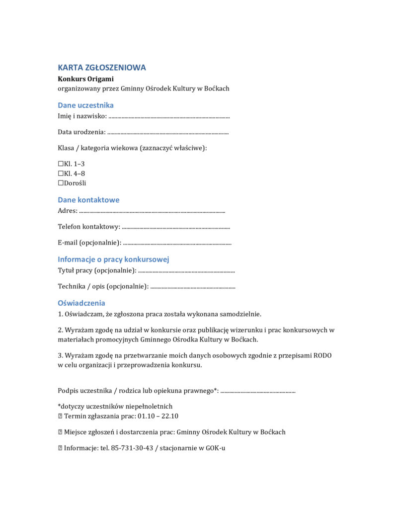 • Zgłoszenia: stacjonarnie w Gminnym Ośrodku Kultury w Boćkach