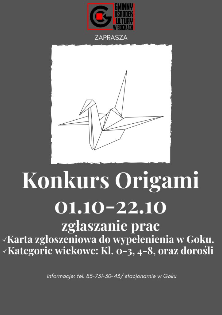 Gminny Ośrodek Kultury w Boćkach zaprasza wszystkich miłośników sztuki origami do udziału w konkursie! To doskonała okazja, aby pokazać swoje umiejętności w składaniu papieru i zmierzyć się z innymi uczestnikami.